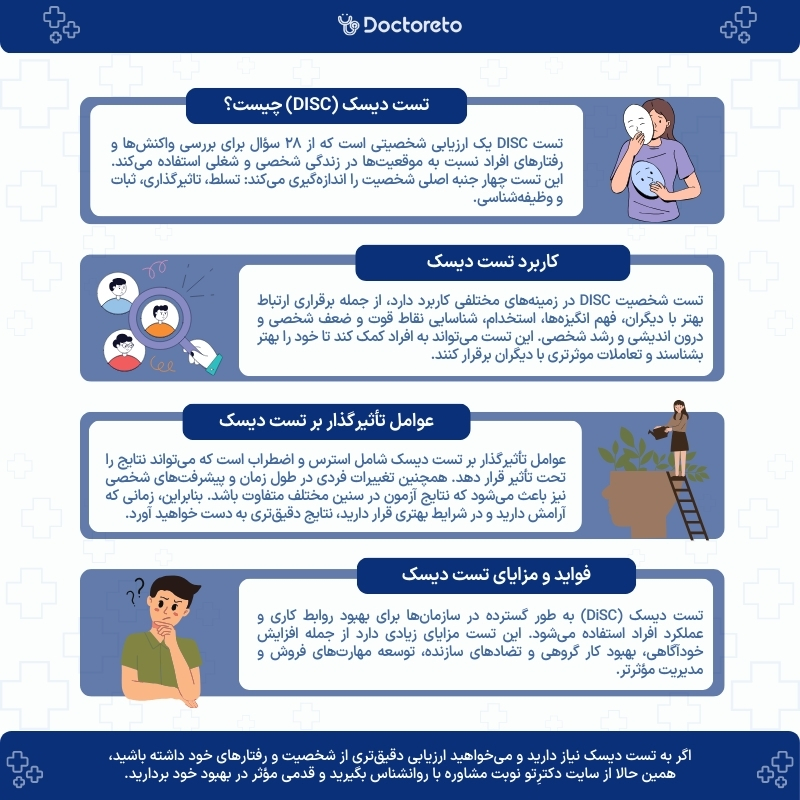 تست disc آنلاین یک ارزیابی شخصیتی خودآزمایی، خود نمرهدهی است. این آزمون شامل ۲۸ سؤال است و در مورد چگونگی واکنش افراد به روشهای قابلپیشبینی نسبت به زمان، وظایف و سایر موقعیتها در خانه و محل کار است.