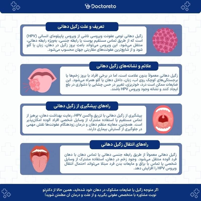 زگیل دهانی چیست؟ ویروس پاپیلومای انسانی (HPV) میتواند دهان، زبان و لبها را هم تحت تاثیر قرار دهد. در بیشتر موارد، سیستم ایمنی قادر است این ویروس را قبل از ایجاد عفونت و ظهور علائم از بین ببرد. با این حال، برخی از گونههای باعث ایجاد زواید کوچک و بیضرری در دهان شوند که به آنها زگیل دهانی گفته میشود. برخی انواع خاص ویروس پاپیلومای انسانی نیز خطرناک هستند و پزشکان آنها را با سرطان دهان مرتبط میدانند. اما اگر بعد از رابطه جنسی محافظت نشده نگران بروز این مسئله هستید بهتر است با یک متخصص عفونی یا داخلی در این باره مشورت کنید. شما میتوانید از سامانه نوبت دهی دکترتو برای دریافت نوبت حضوری و مشاوره آنلاین با بهترین پزشکان استفاده کنید.