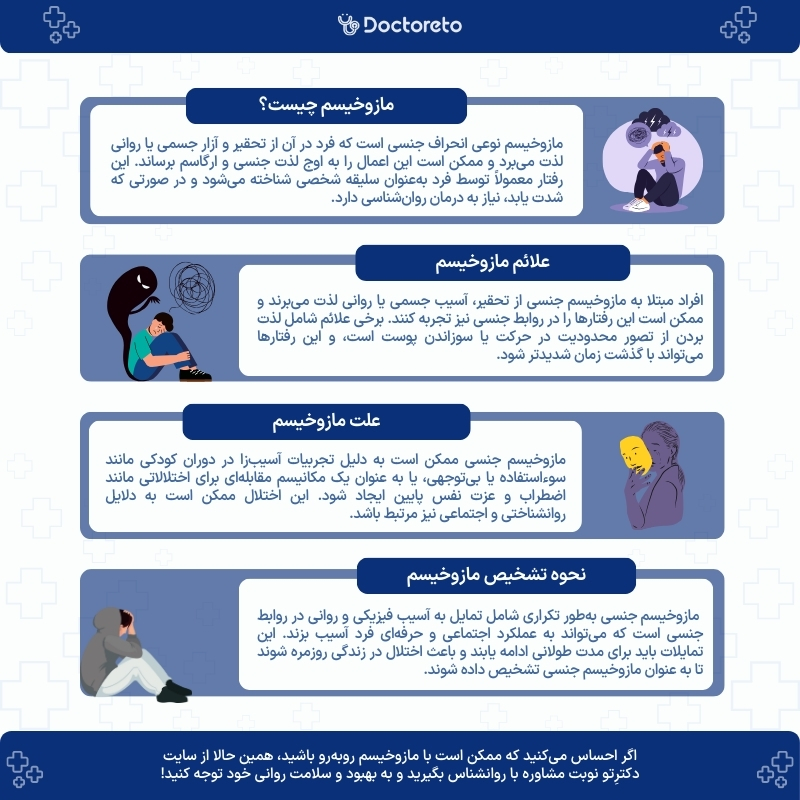 مازوخیسم یا آزارخواهی نوعی گرایش جنسی (براساس DSM5) است که در آن فرد از تجربه درد، تحقیر یا رنج لذت میبرد. تمایل به کنترل، آسیب و درد یا تسلیمشدن از نشانههای آزارخواهی هستند. همچنین مازوخیسم میتواند ریشه جنسی یا غیر جنسی داشتهباشد که معمولا در نوجوانان و بزرگسالان ظاهر میشود. اما علت مازوخیسم چیست و چگونه درمان میشود؟ در ادامه این مطلب از دکترتو با ما همراه باشید. اگر با فرد مازوخیست در ارتباط هستید یا نیاز به تشخیص این بیماری دارید، میتوانید در سایت دکترتو از روانشناس یا روانپزشک نوبت ویزیت حضوری یا مشاوره دریافت کنید.
